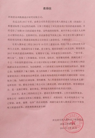 1月29日上午,引黃入冀補淀工程建管局河南工程建設部發來表揚信,對我公司在工程建設期間的貢獻表示感謝,并對設代人員的工作給予了高度肯定。