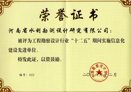 “十二五”期間,我公司以信息化為企業(yè)發(fā)展的重要原動力,先后在綜合信息平臺建設(shè)、三維協(xié)同設(shè)計平臺建設(shè)、水利信息化業(yè)務(wù)拓展等方面取得了長足的發(fā)展,公司管理水平、規(guī)劃設(shè)計產(chǎn)品質(zhì)量、公司業(yè)務(wù)拓展等實現(xiàn)了跨越式發(fā)展,得到了業(yè)內(nèi)的認(rèn)可,被中國勘察設(shè)計協(xié)會評為工程勘察設(shè)計行業(yè)“十二五”期間實施信息化建設(shè)“先進(jìn)單位”!數(shù)字工程中心主任高英獲得 “先進(jìn)個人”榮譽稱號!
