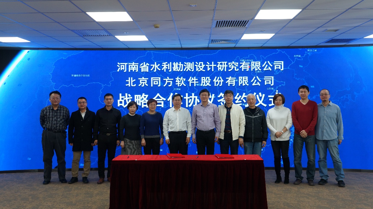 2019年3月18日,河南省水利勘測設計研究有限公司與北京同方軟件股份有限公司在北京舉行戰略合作協議簽約儀式。同方股份有限公司副總裁周俠、大數據產業部副總經理李小華、北京同方軟件股份有限公司副總經理侯小龍、大數據技術中心總經理郝斌、大數據技術中心副總經理石大為、水務事業部總經理葛彥超,河南省水利勘測設計研究有限公司董事長翟淵軍、副總經理賈少燕、數字工程院院長高英、數字工程院總工張玉明等出席簽約儀式。