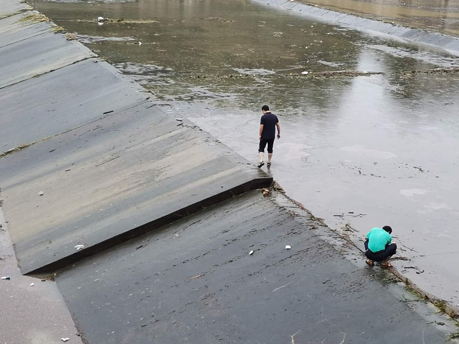 技術副總監田耕(圖中左二)現場指導渦河堤頂排水工程施工