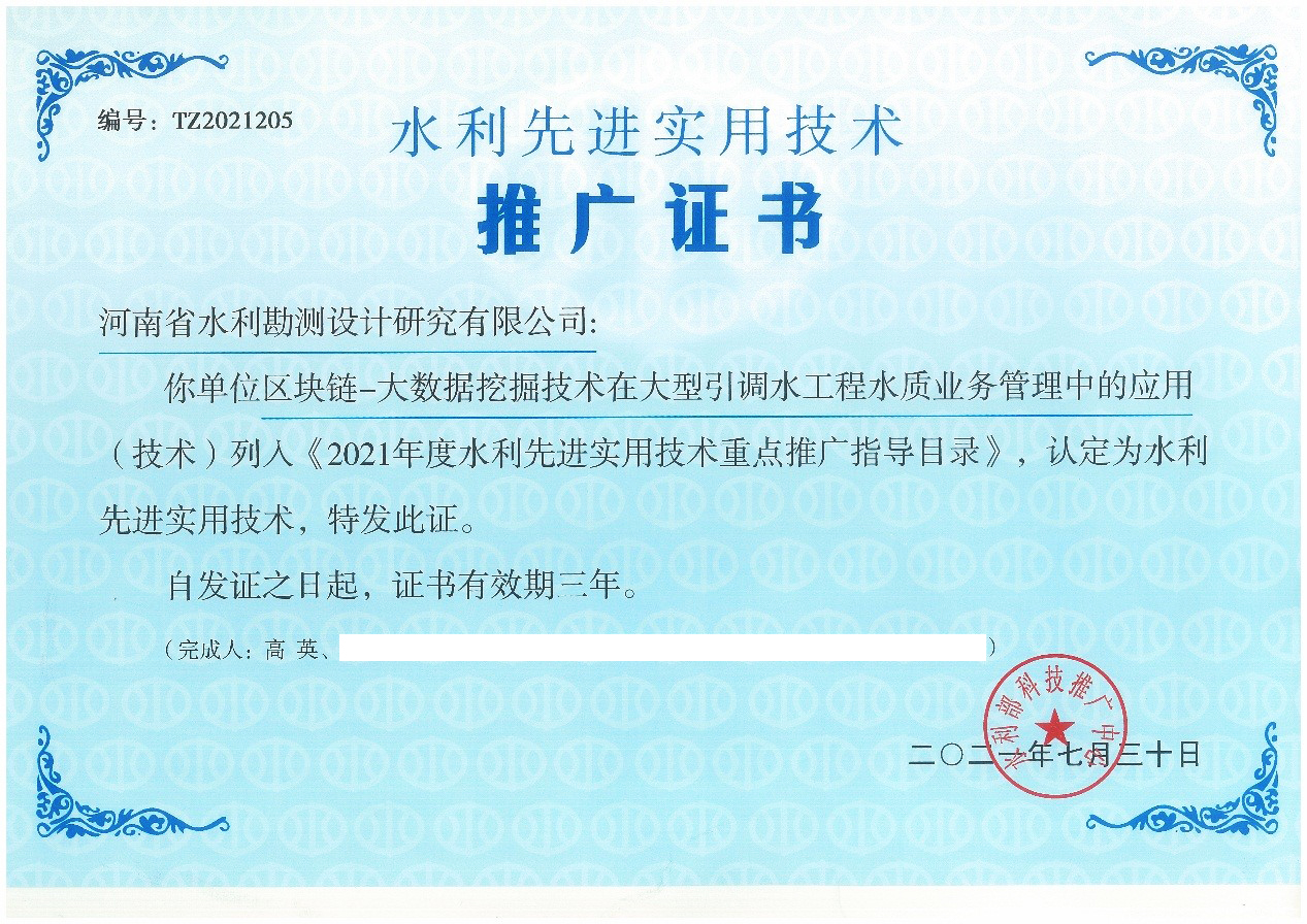 近日,豫水設計公司技術創新成果“區塊鏈——大數據挖掘技術在大型引調水工程水質業務管理中的應用”成功入選水利部《2021年水利先進實用技術重點推廣指導目錄》,被認定為水利先進實用技術。