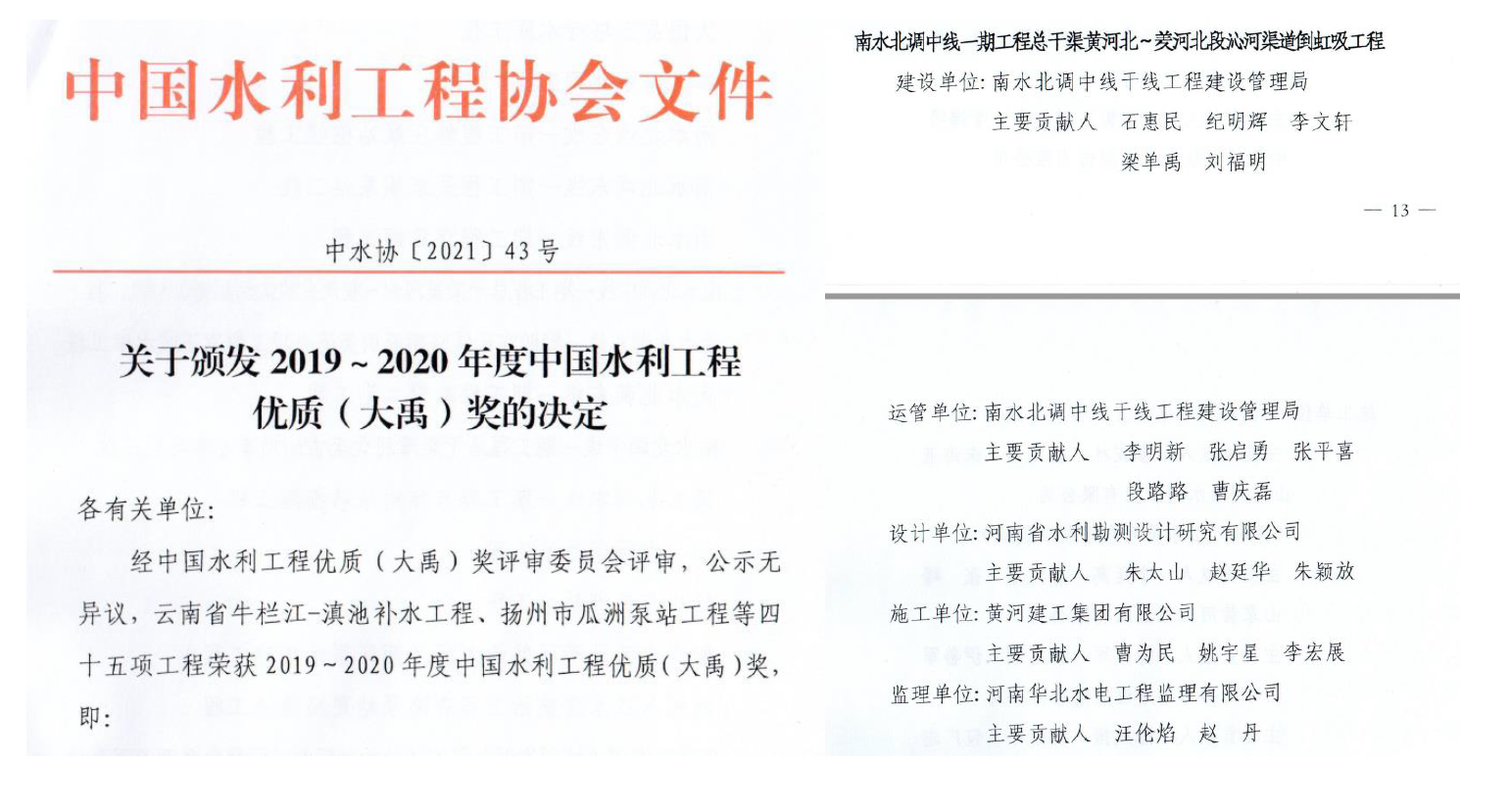 近日,中國水利工程優(yōu)質(zhì)(大禹)獎評選結(jié)果揭曉,由豫水設計公司擔綱設計的南水北調(diào)中線一期工程總干渠黃河北~羑河北段沁河渠道倒虹吸工程,憑借科學設計和精良施工,榮獲2019年~2020年度中國水利工程優(yōu)質(zhì)(大禹)獎。