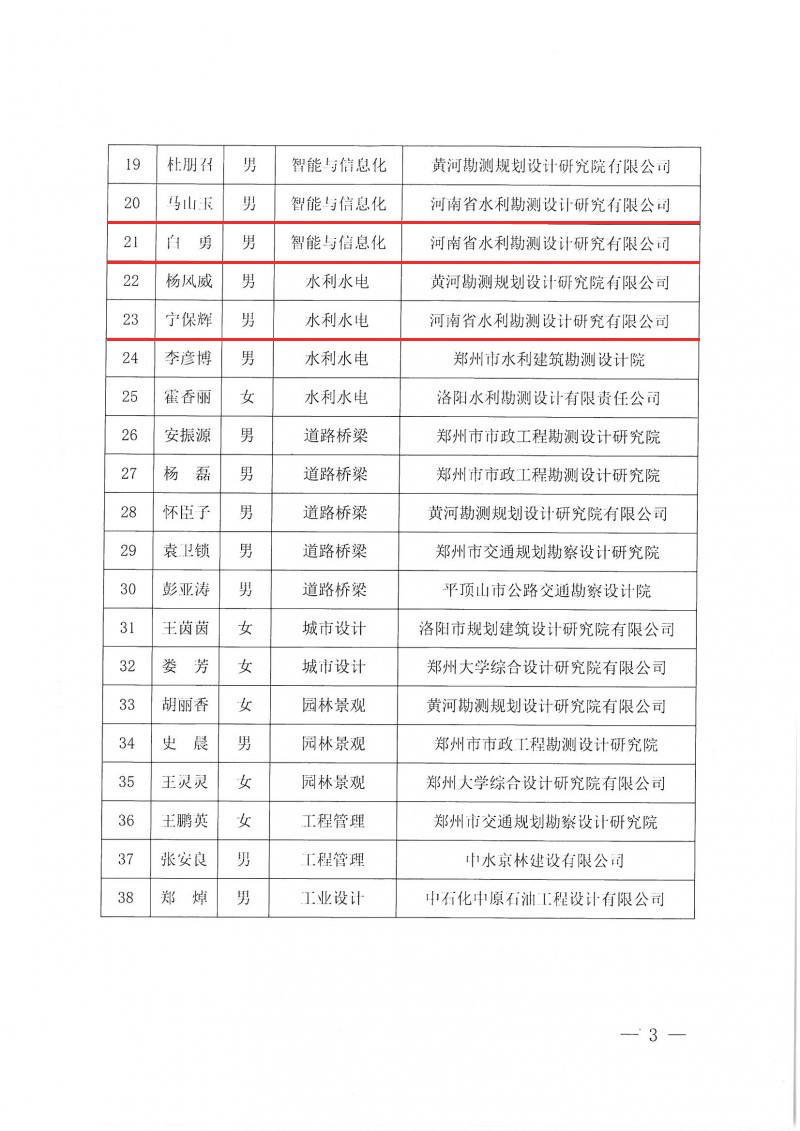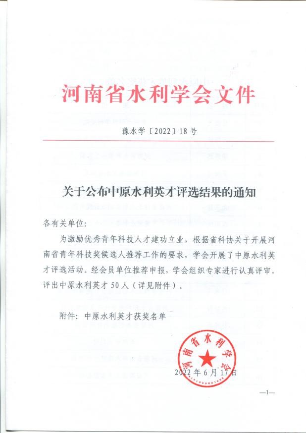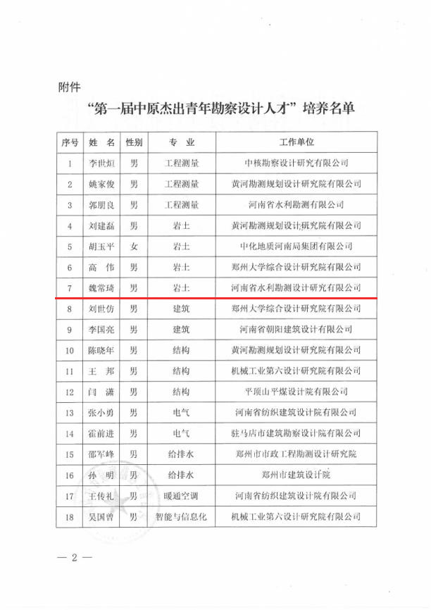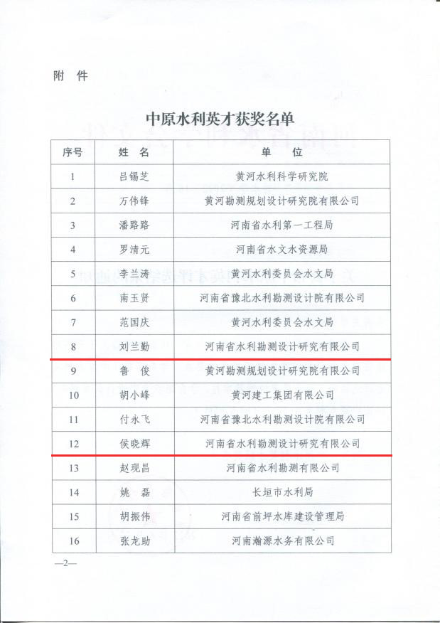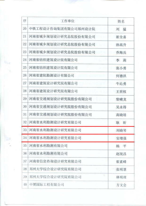 安增強、耿昕、劉曉琴同志獲得河南省勘察設(shè)計協(xié)會給予的“河南省優(yōu)秀青年勘察設(shè)計師”表彰;寧保輝、馬山玉、白勇、魏常琦同志被河南省工程勘察設(shè)計行業(yè)協(xié)會列入“第一屆中原杰出青年勘察設(shè)計人才”培養(yǎng)名單;劉蘭勤、侯曉輝同志被河南省水利學(xué)會評為“中原水利英才”。