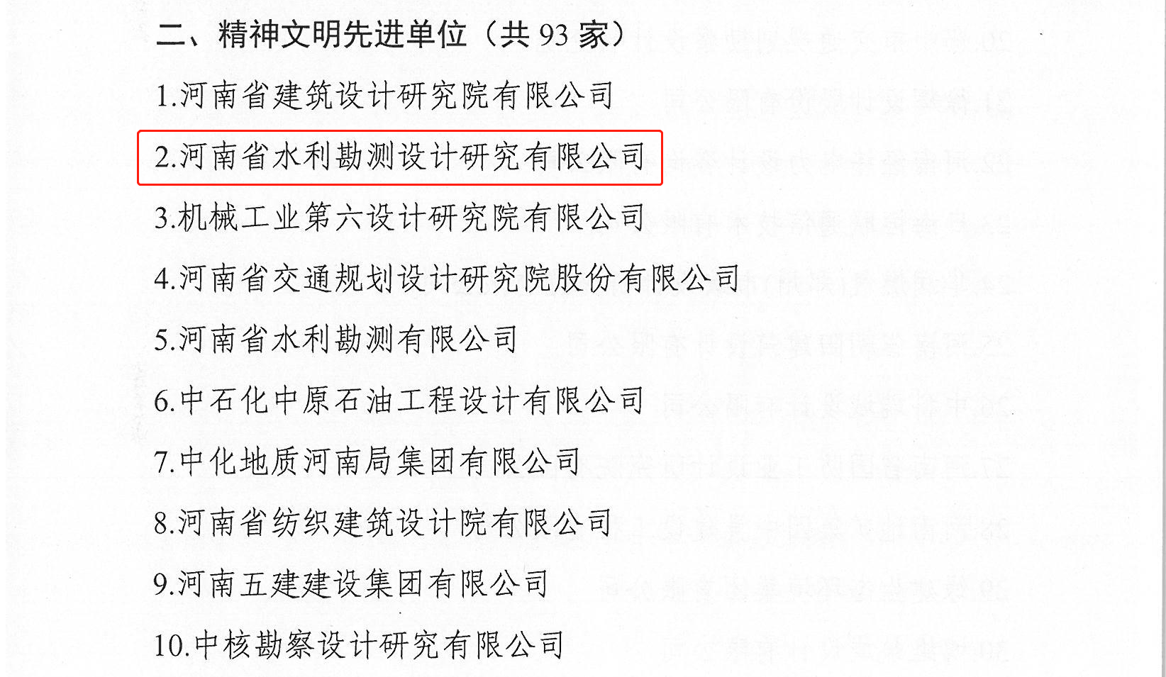 2月21日,由河南省工程勘察設計行業(yè)協(xié)會組織的“2022年度河南省工程勘察設計行業(yè)協(xié)會優(yōu)秀會員和個人名單”評選活動公布結(jié)果,我公司榮獲“優(yōu)秀勘察設計咨詢企業(yè)”、“精神文明先進單位”、“轉(zhuǎn)型發(fā)展標桿企業(yè)”三項榮譽稱號。公司董事長翟淵軍被授予“優(yōu)秀院長”,公司副總經(jīng)理趙廷華、副總經(jīng)理袁榆梁、監(jiān)事會主席閆汝華3名同志被授予“優(yōu)秀專家”。