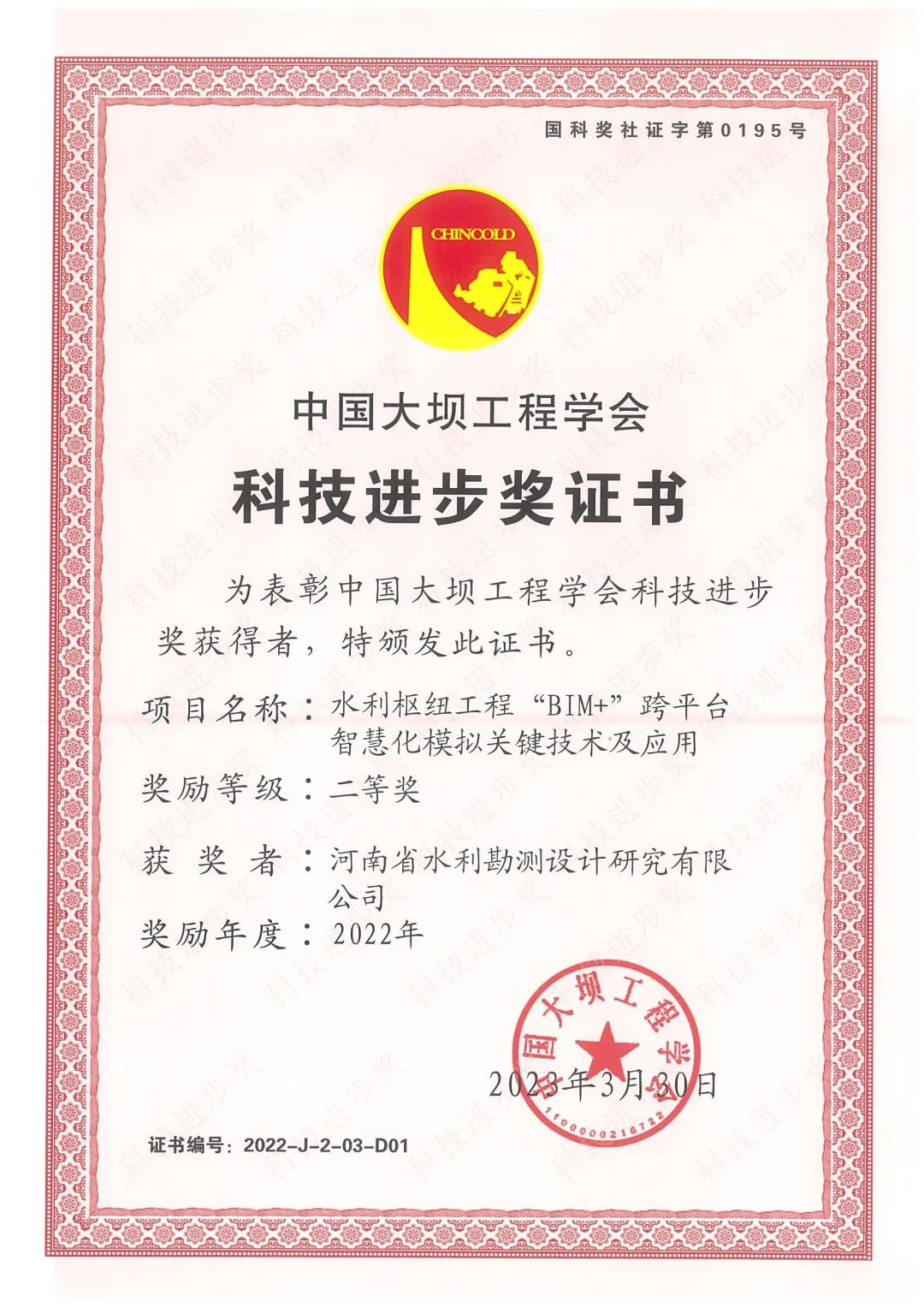公司數(shù)字工程院深耕BIM+技術(shù)在水利行業(yè)的應(yīng)用,牽頭完成的科研成果“水利樞紐工程“BIM+”跨平臺智慧化模擬關(guān)鍵技術(shù)及應(yīng)用”喜獲2022年度中國大壩工程學(xué)會科技進步獎二等獎。