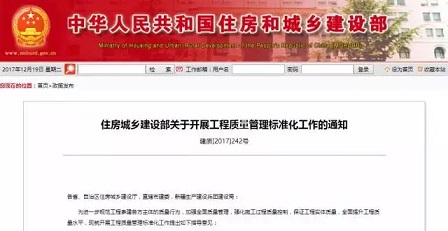 近日,住建部下發(fā)《住房城鄉(xiāng)建設(shè)部關(guān)于開(kāi)展工程質(zhì)量管理標(biāo)準(zhǔn)化工作的通知》(以下簡(jiǎn)稱《通知》)。提出到2020年底,要力爭(zhēng)“全面推行工程質(zhì)量管理標(biāo)準(zhǔn)化”。