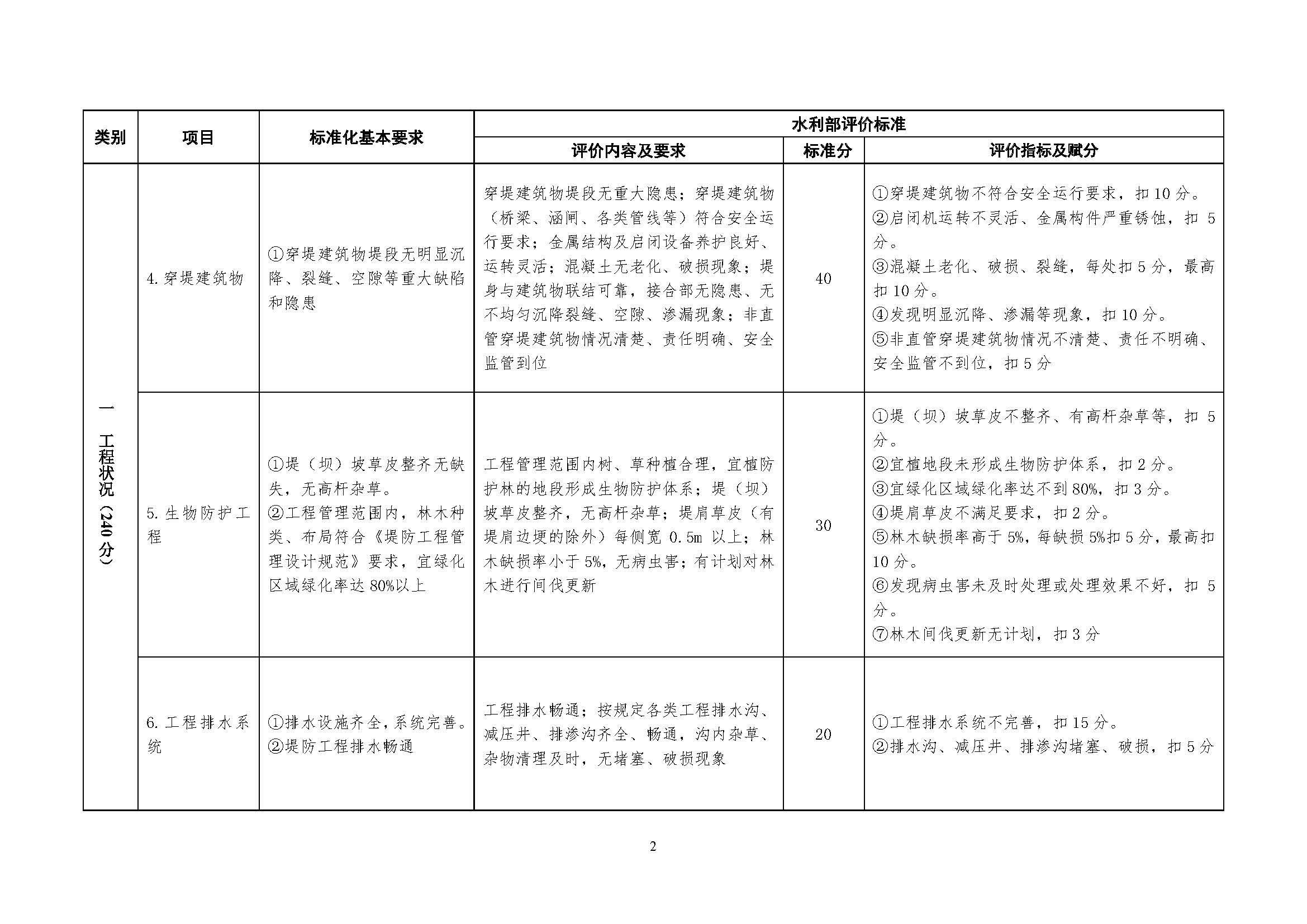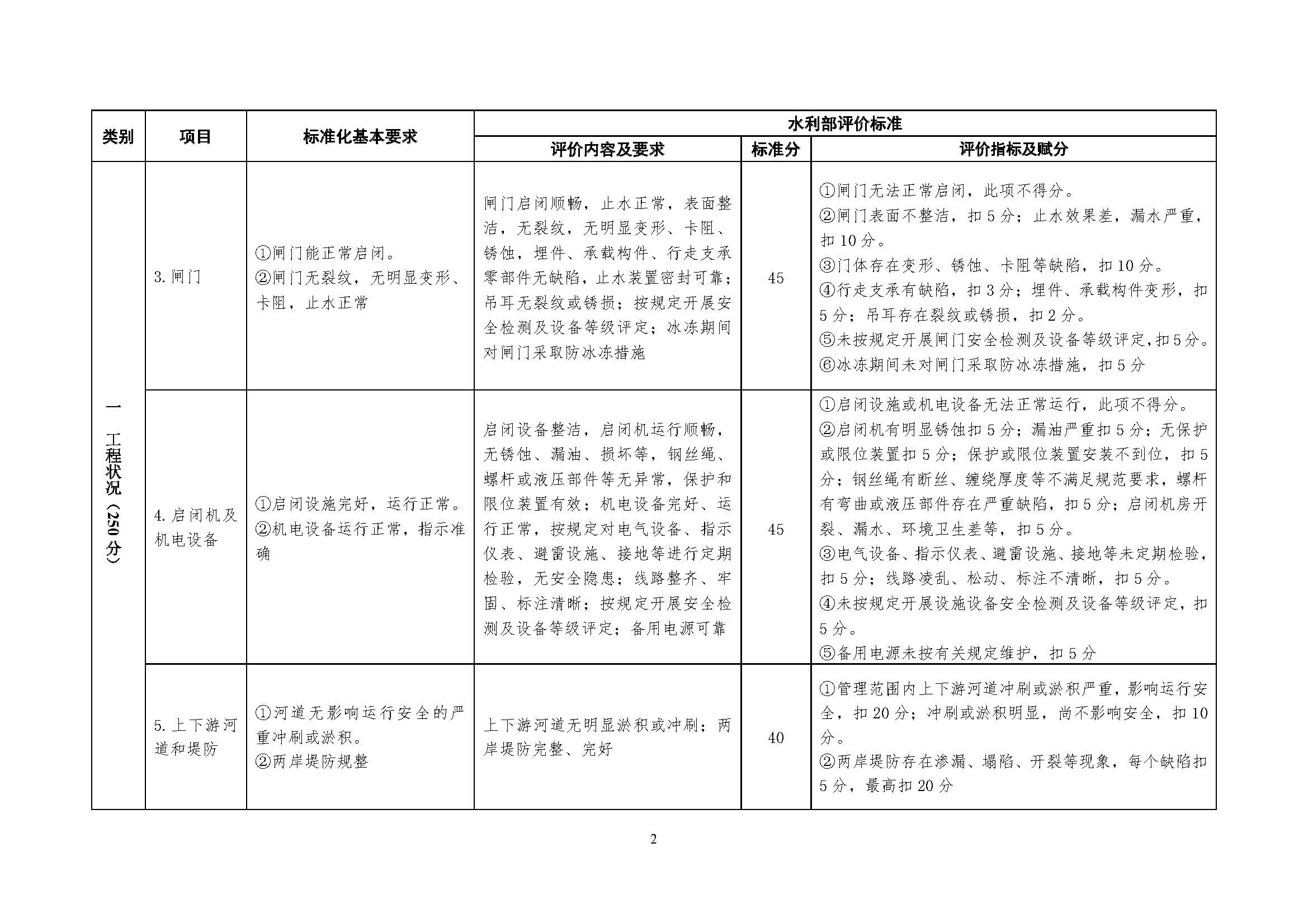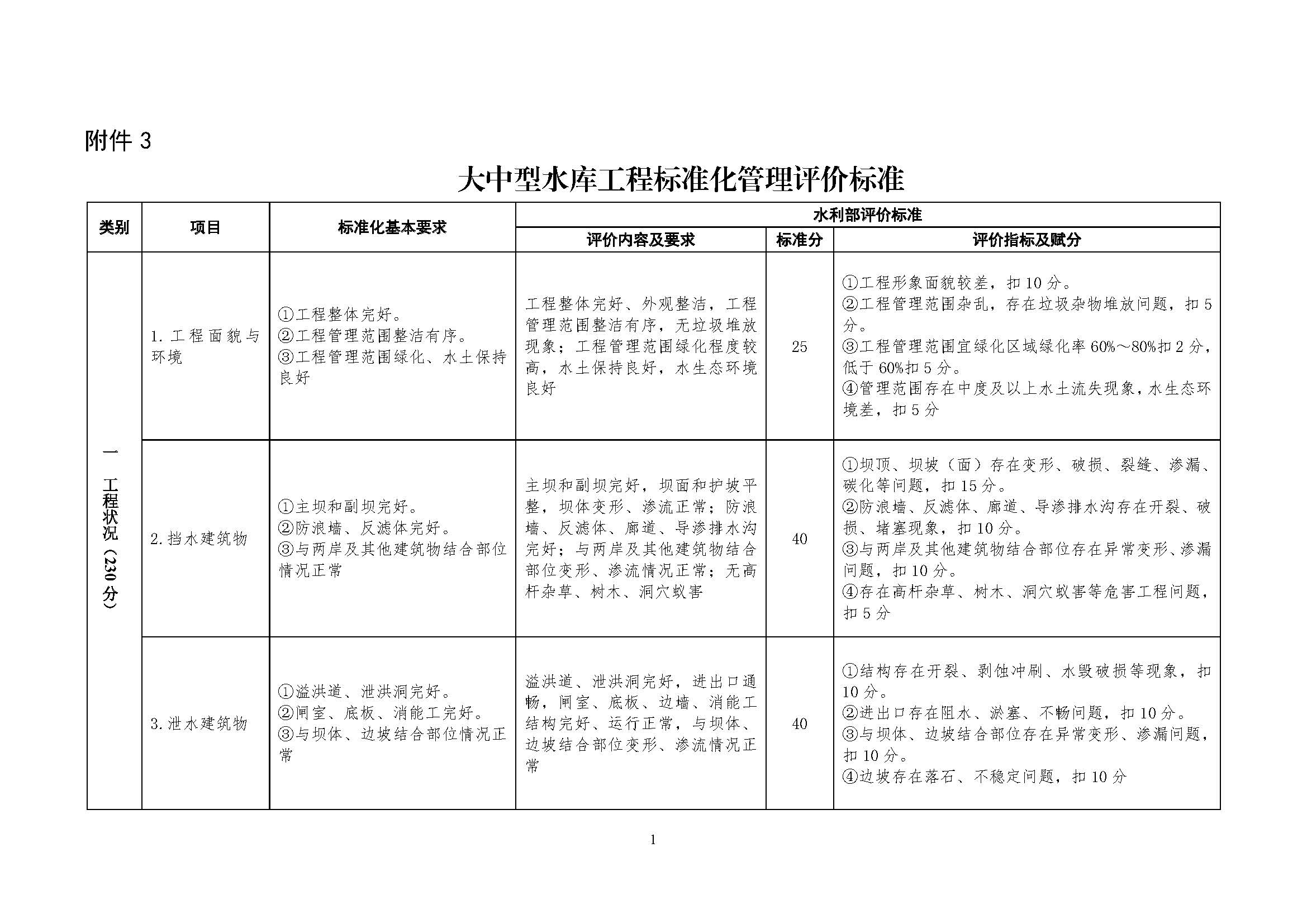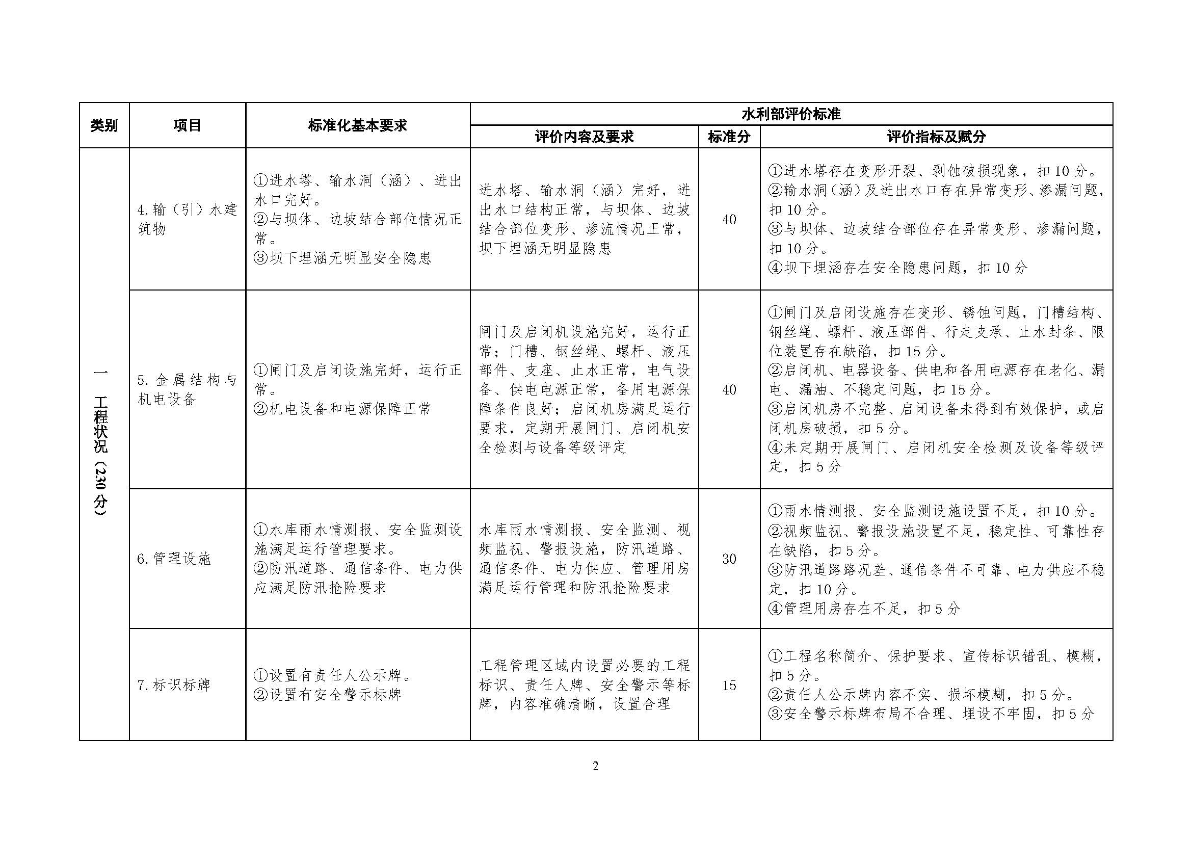 與《指導意見》相配套,同時印發了《評價辦法》及其評價標準,對標準化評價的適用范圍、評價主體、評價程序等作出規定,包括大中型水庫、大中型水閘、3級以上堤防評價標準。