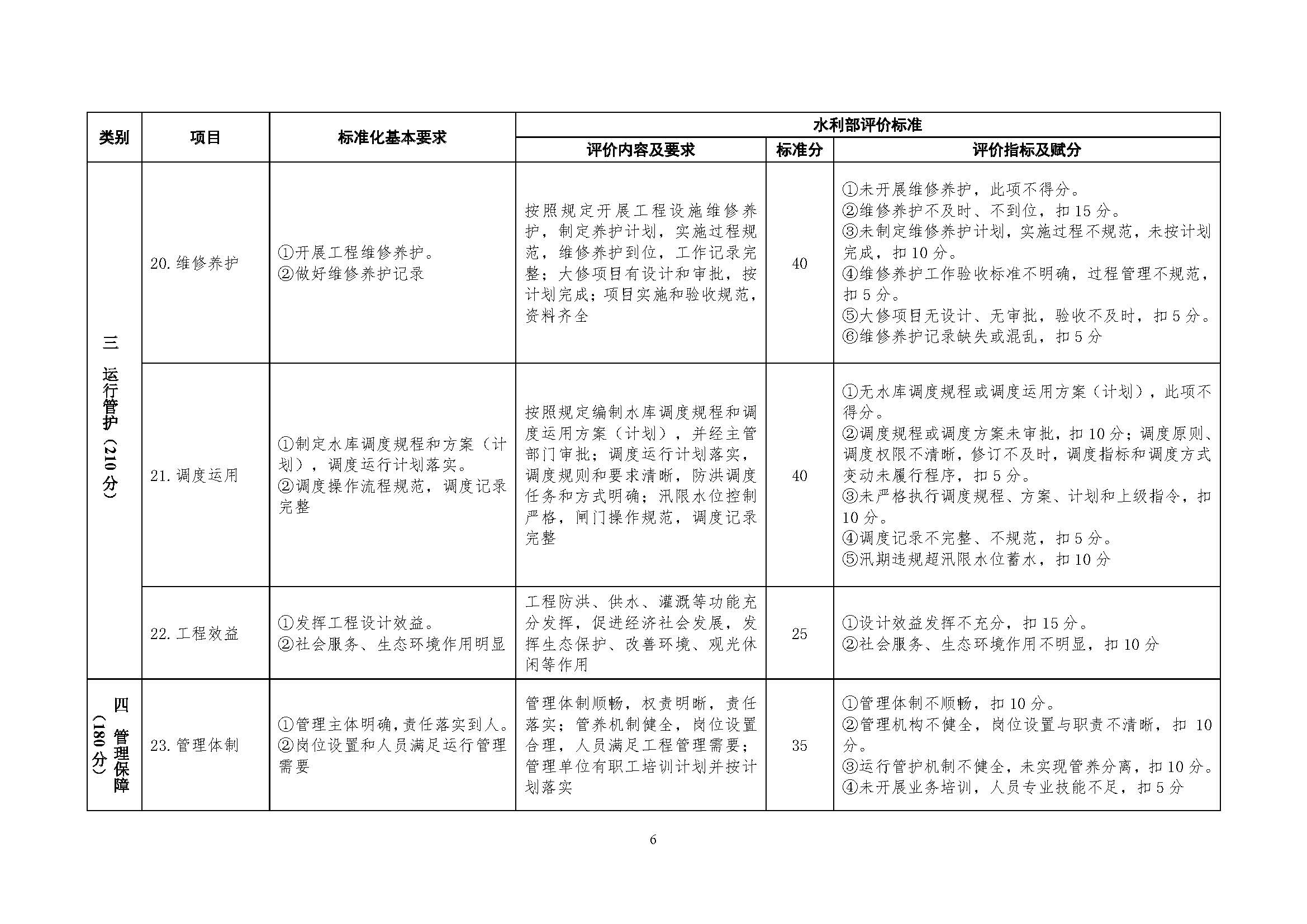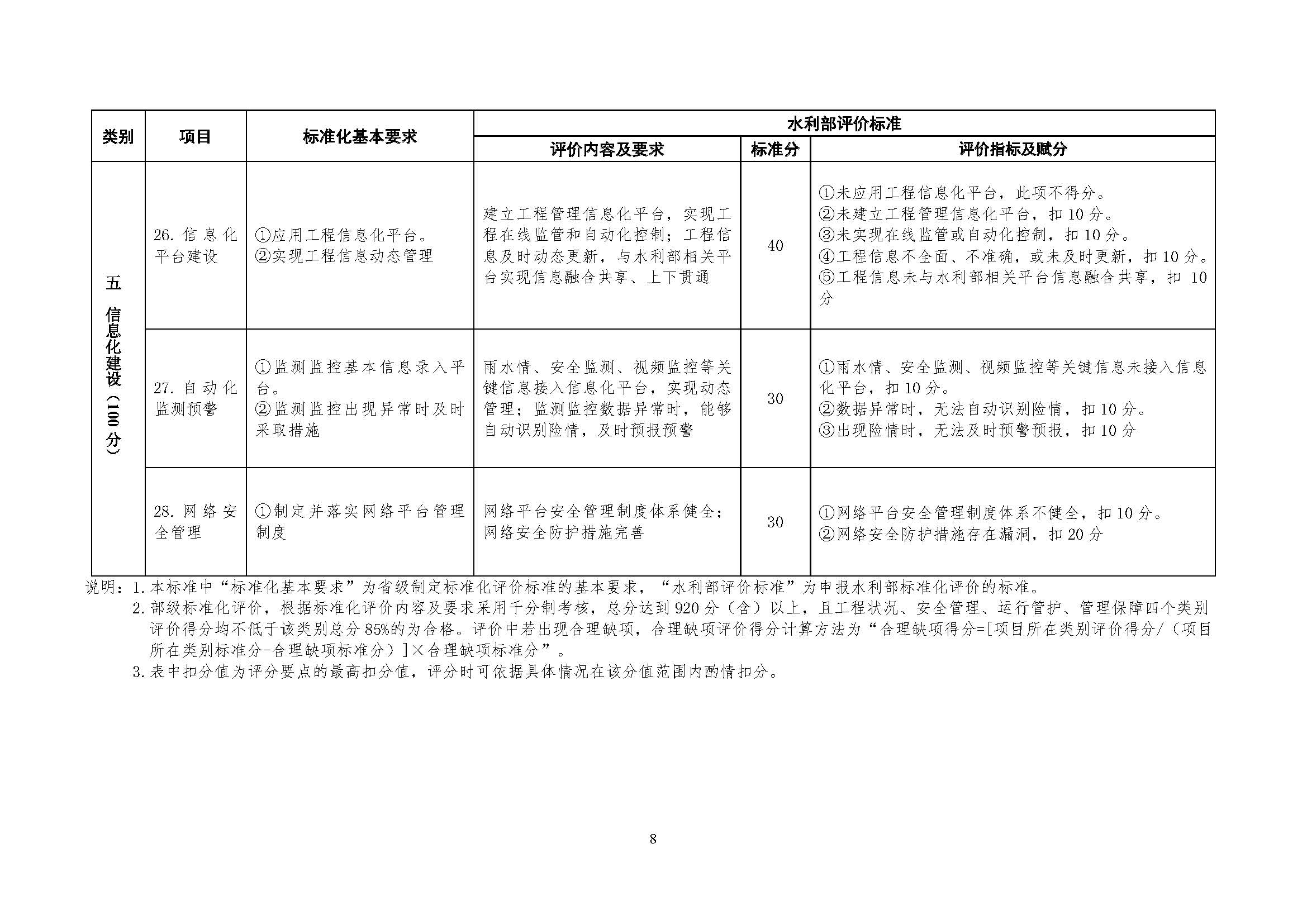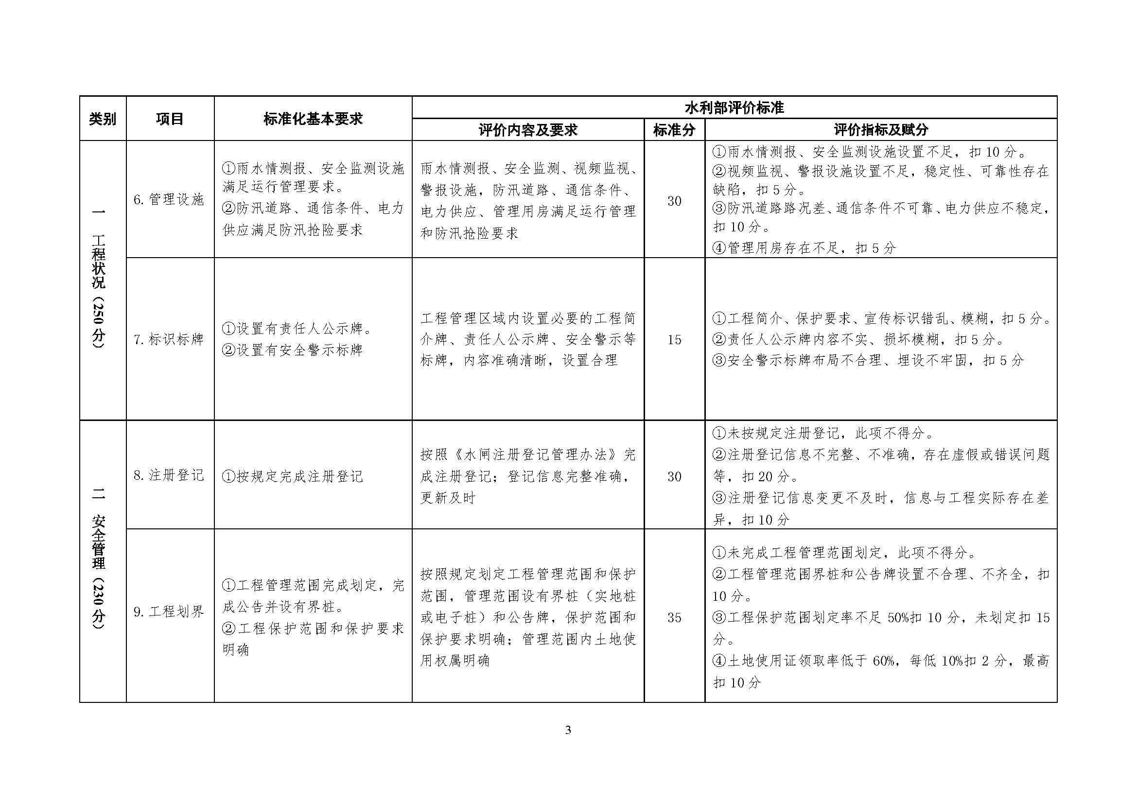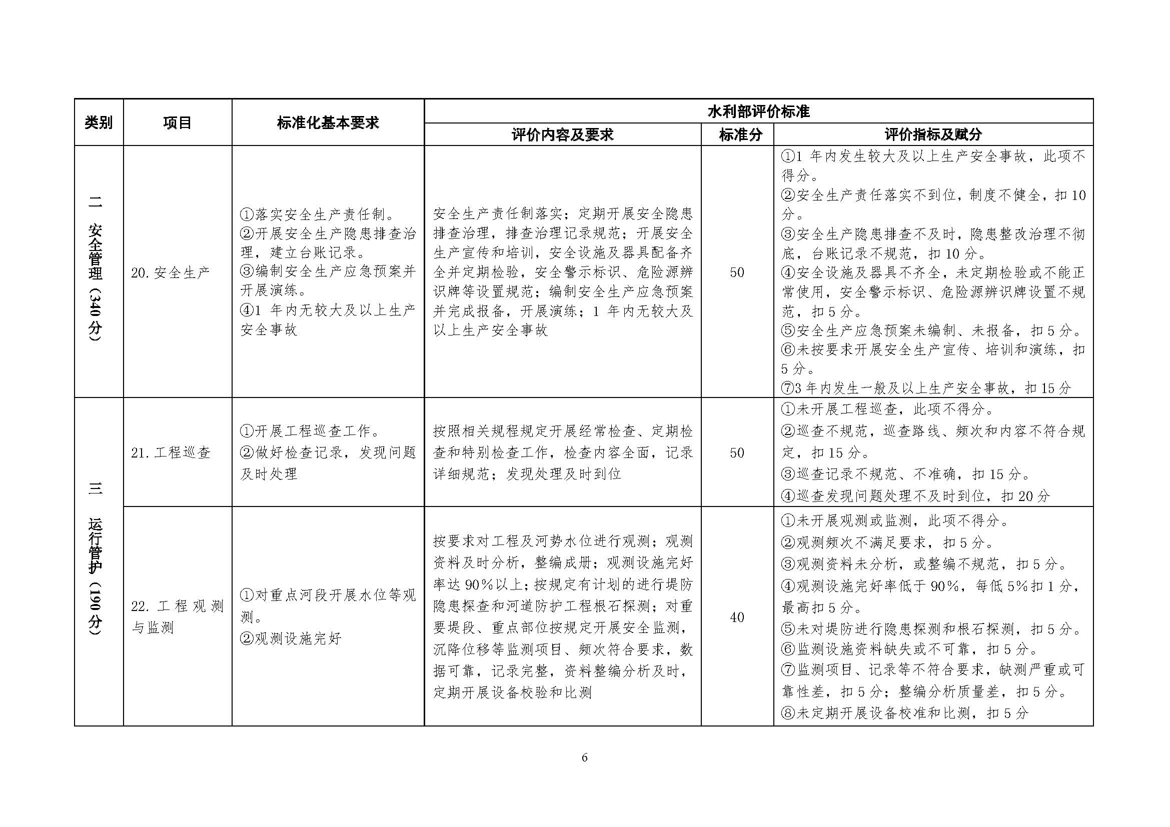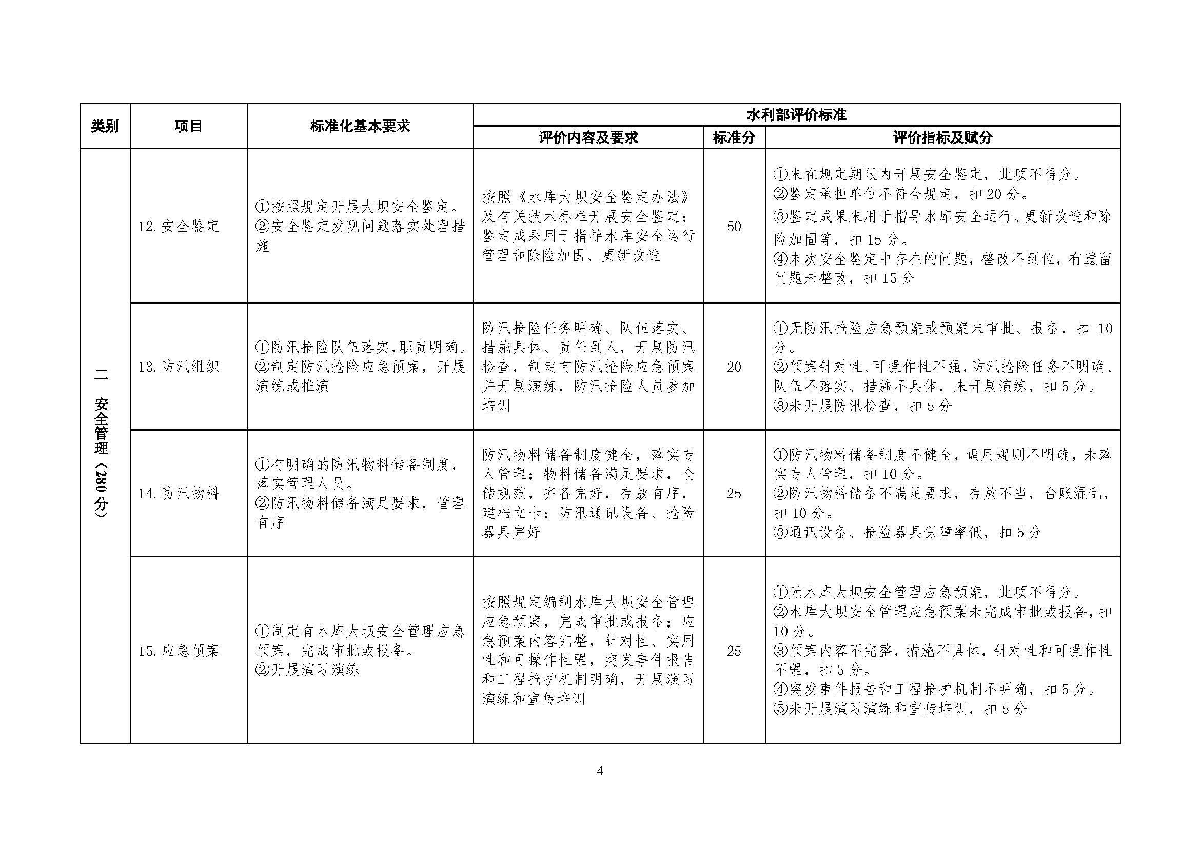與《指導意見》相配套,同時印發了《評價辦法》及其評價標準,對標準化評價的適用范圍、評價主體、評價程序等作出規定,包括大中型水庫、大中型水閘、3級以上堤防評價標準。