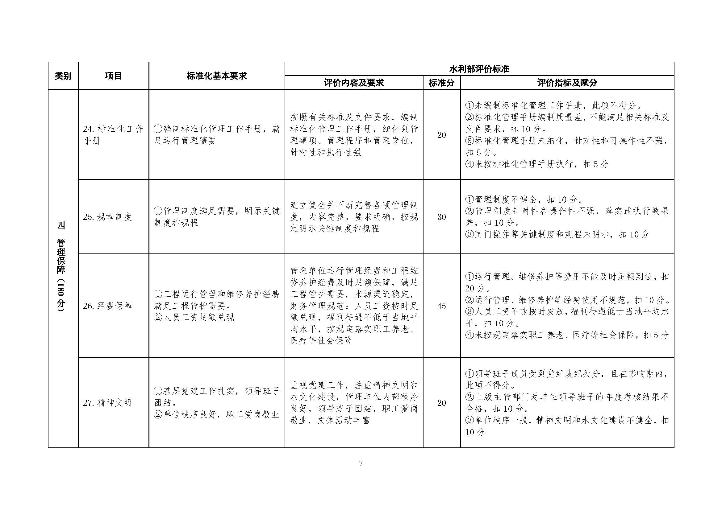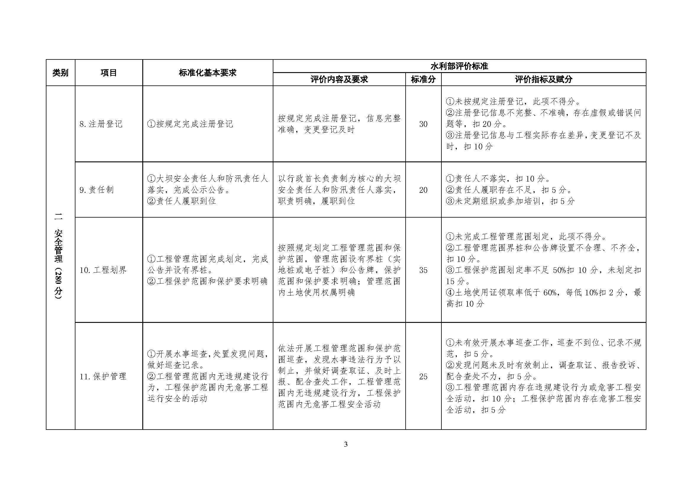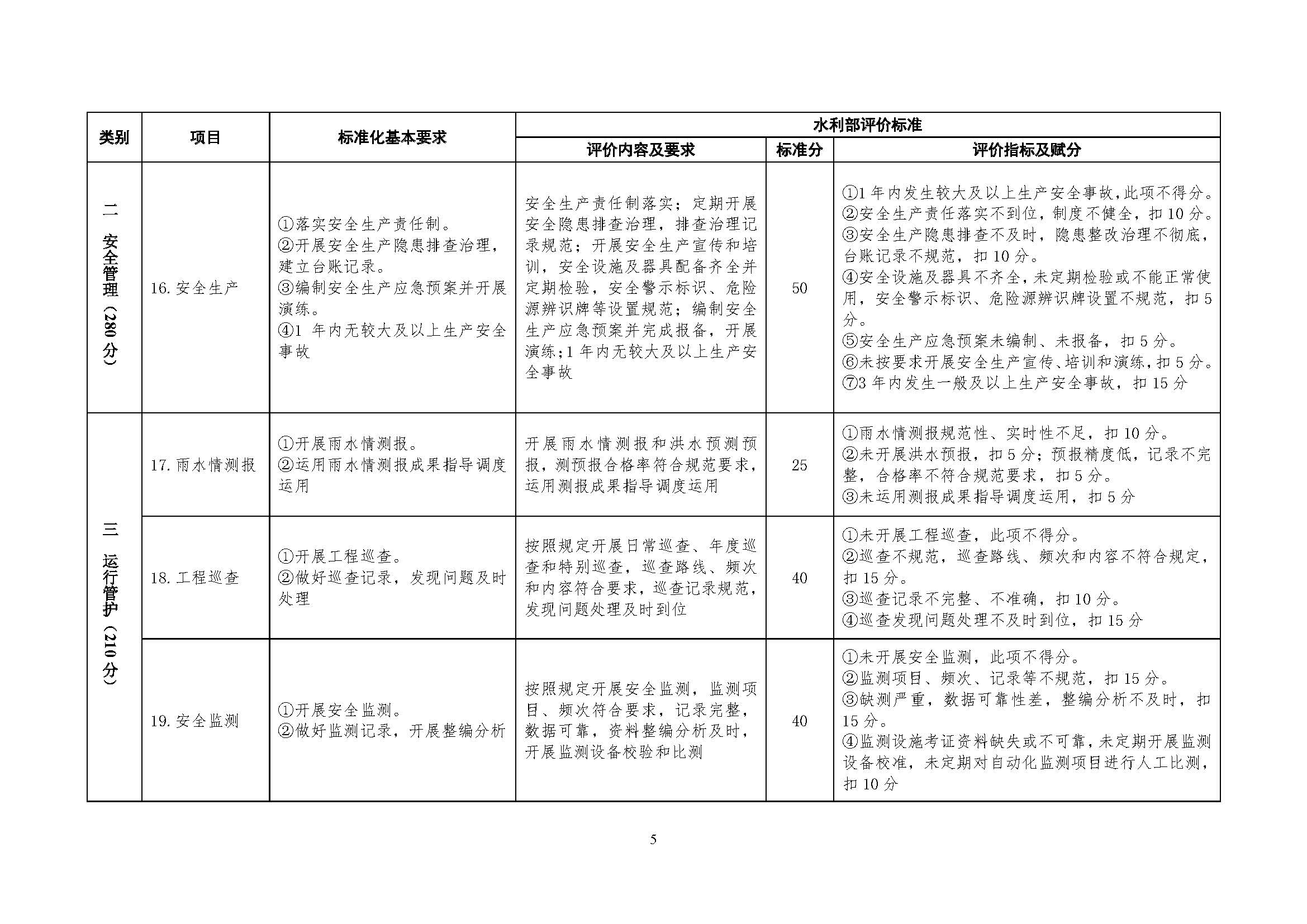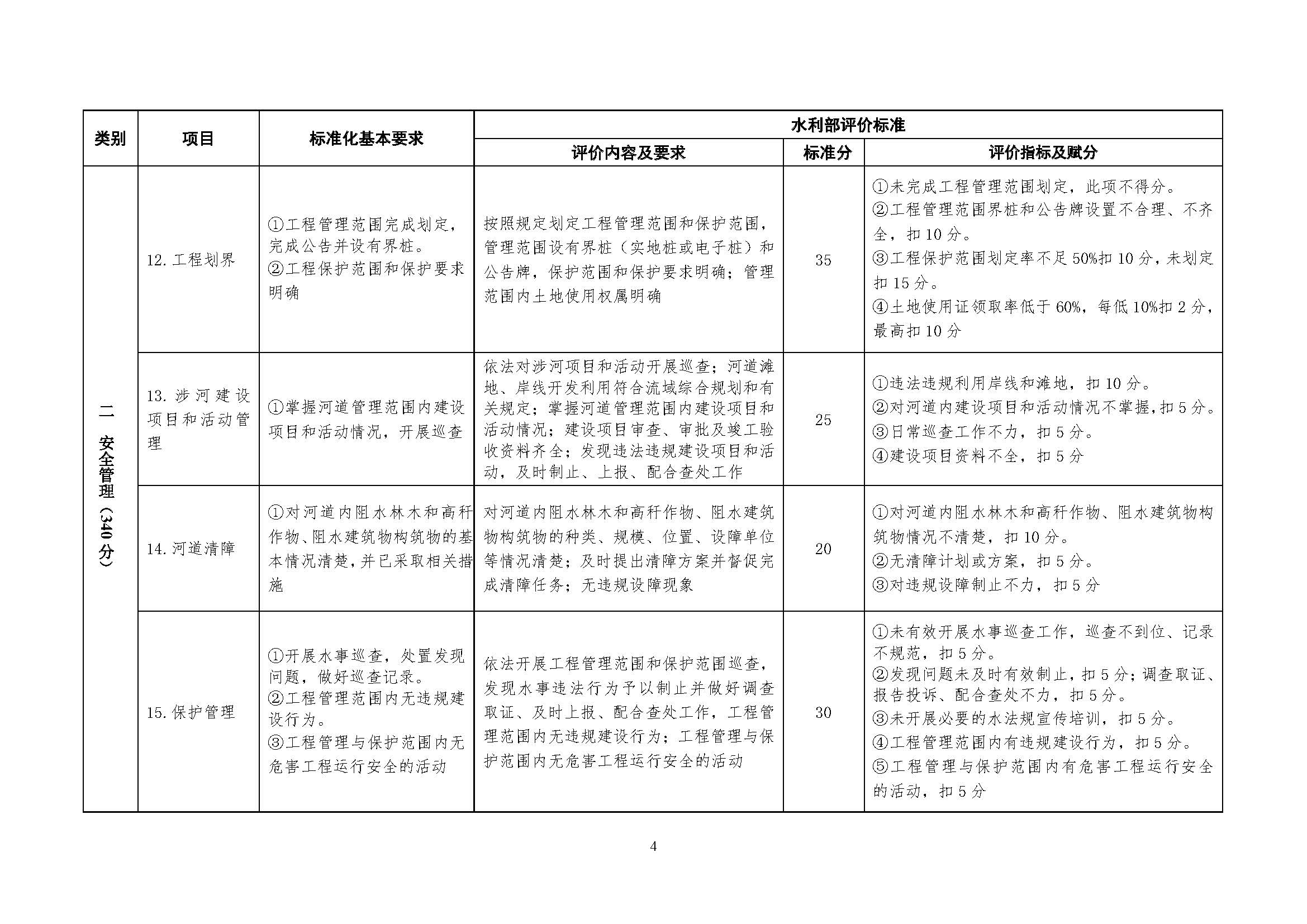 與《指導意見》相配套,同時印發了《評價辦法》及其評價標準,對標準化評價的適用范圍、評價主體、評價程序等作出規定,包括大中型水庫、大中型水閘、3級以上堤防評價標準。