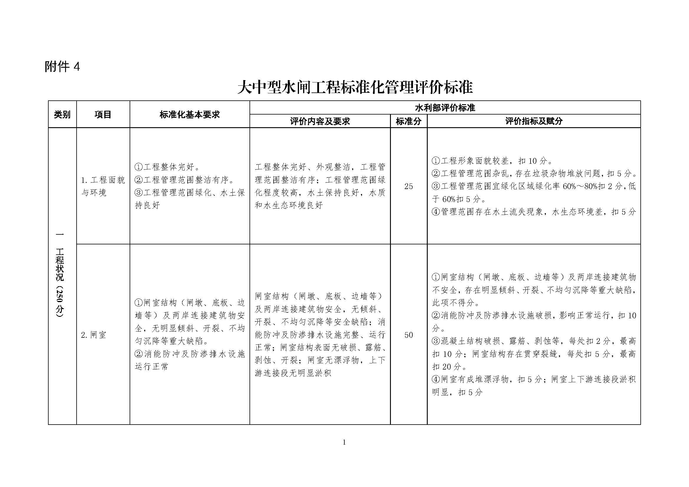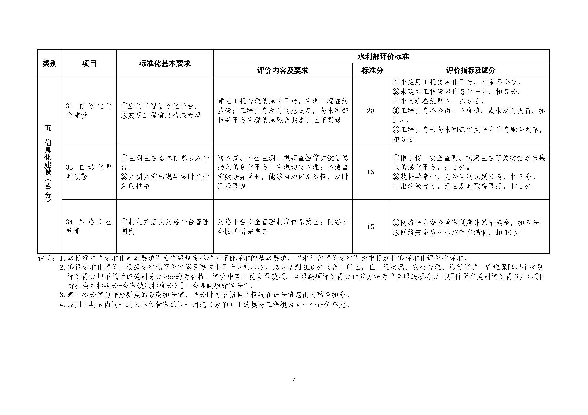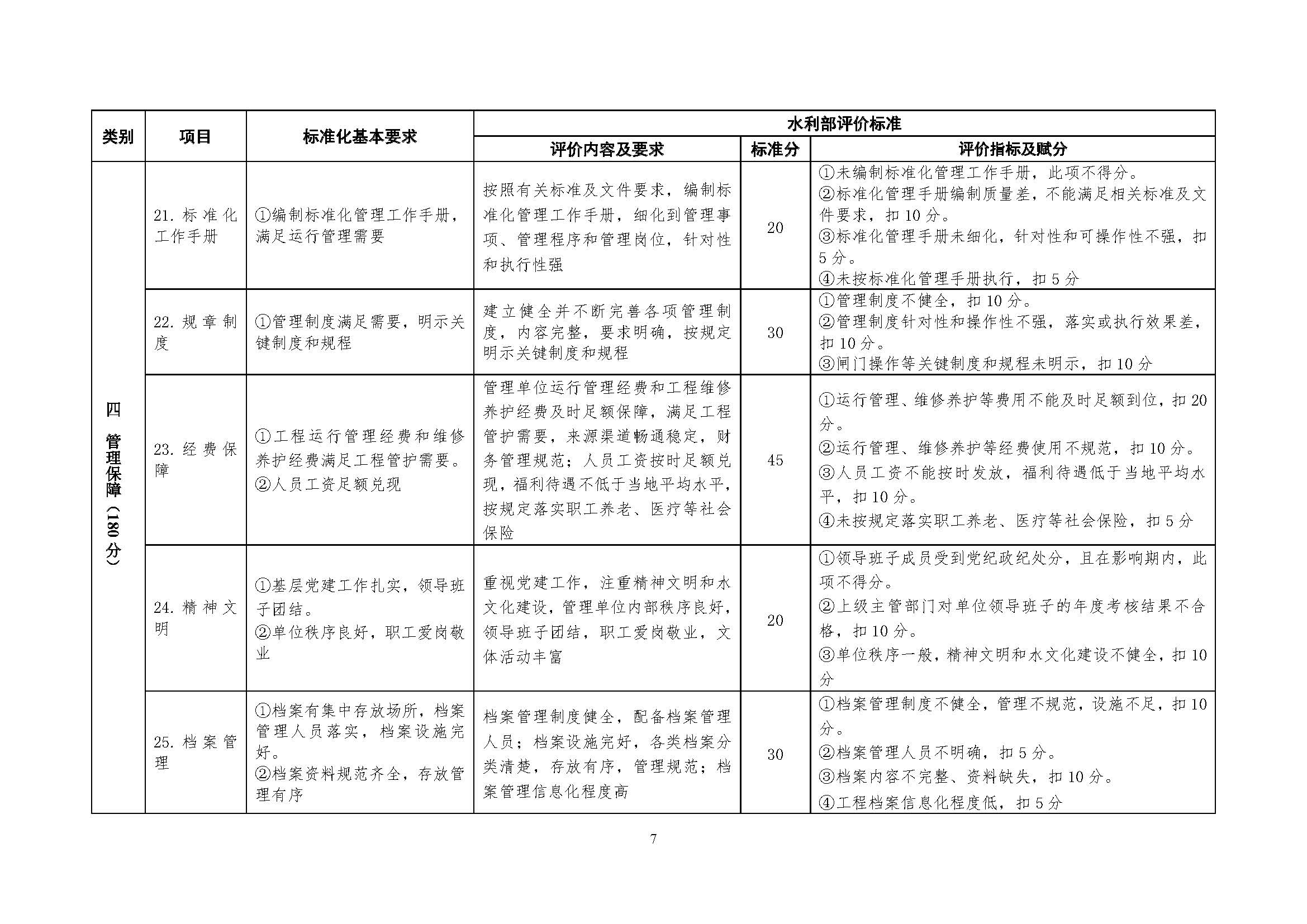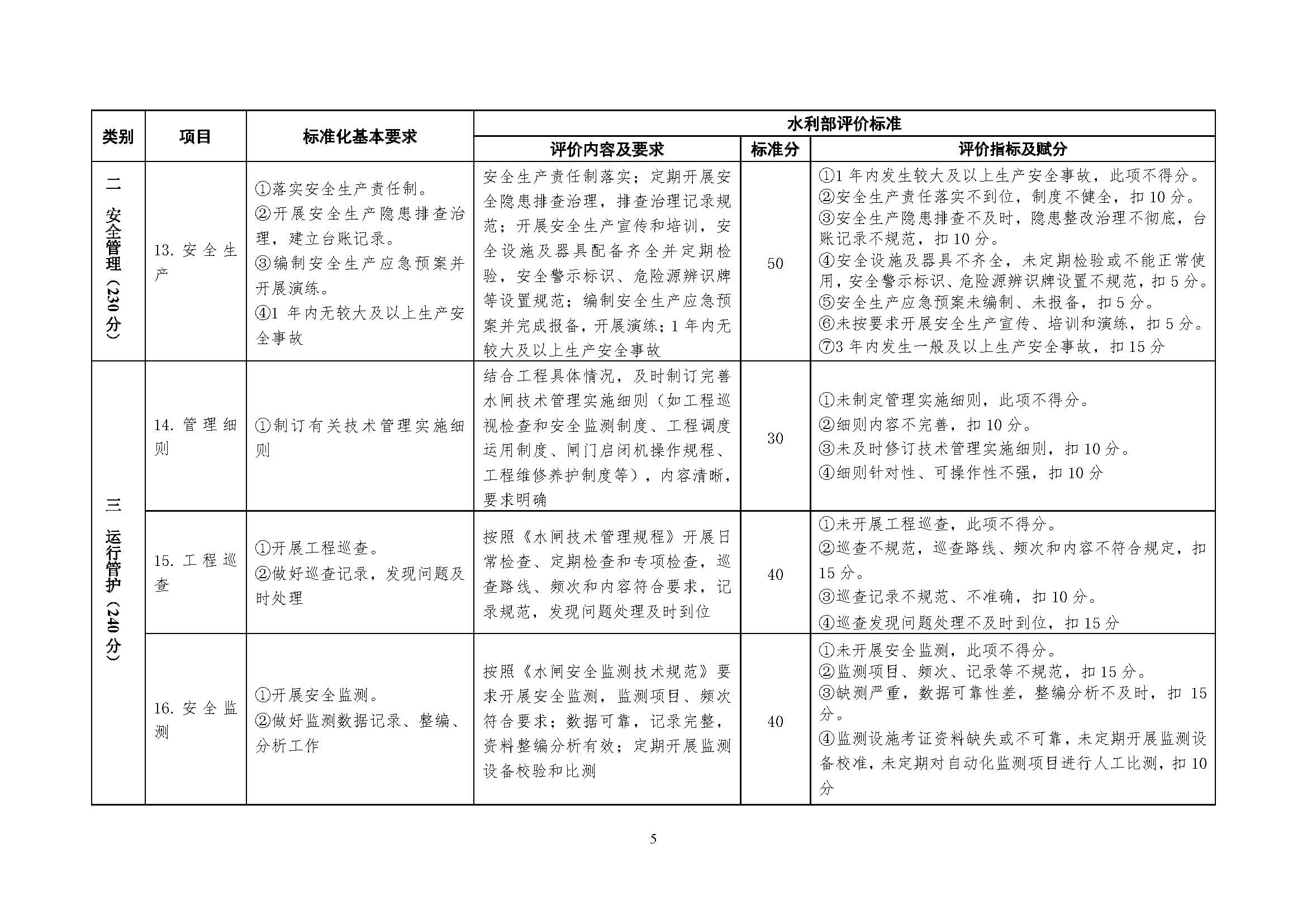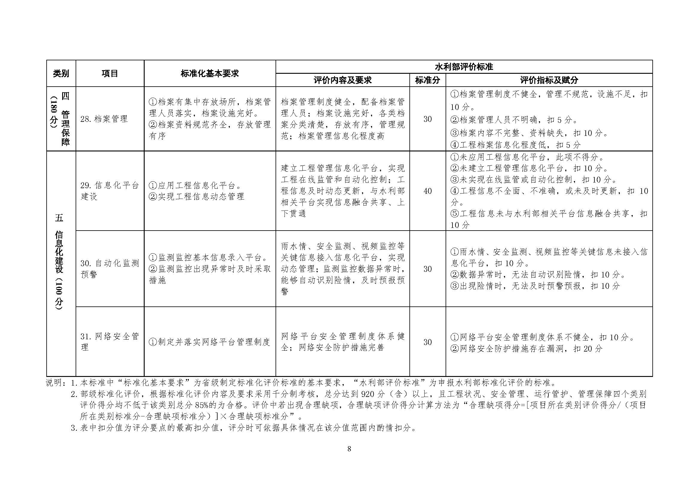 與《指導意見》相配套,同時印發了《評價辦法》及其評價標準,對標準化評價的適用范圍、評價主體、評價程序等作出規定,包括大中型水庫、大中型水閘、3級以上堤防評價標準。
