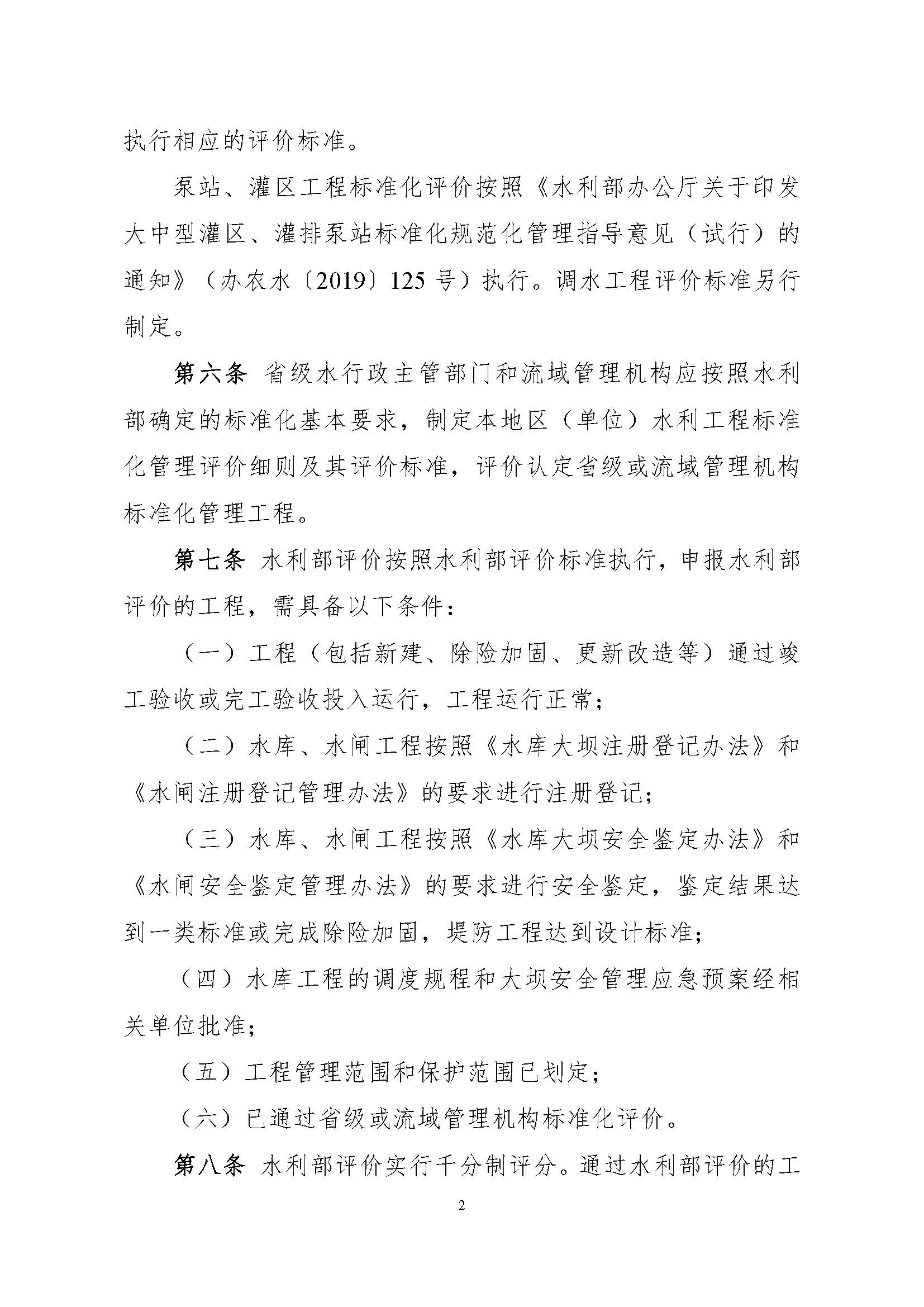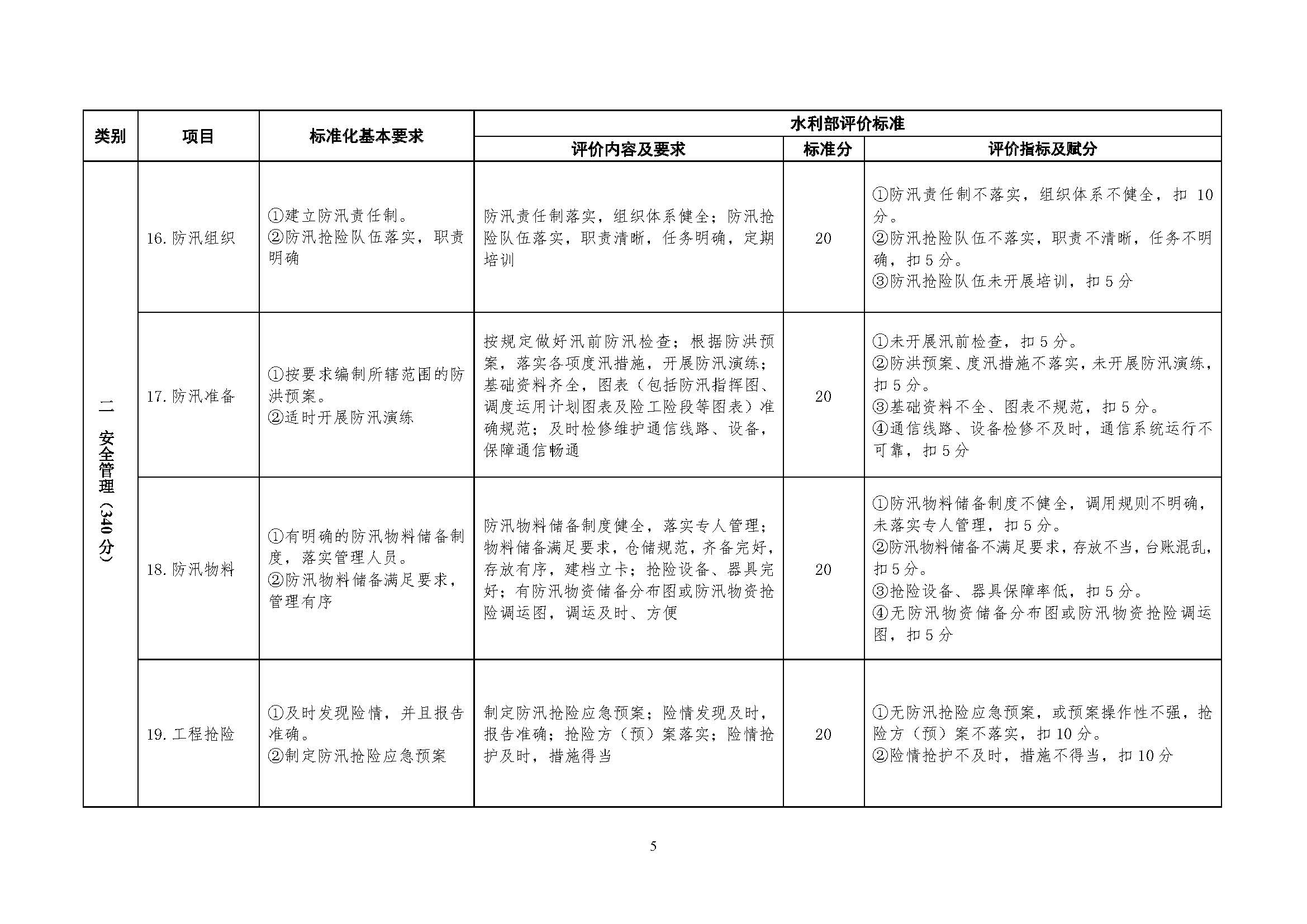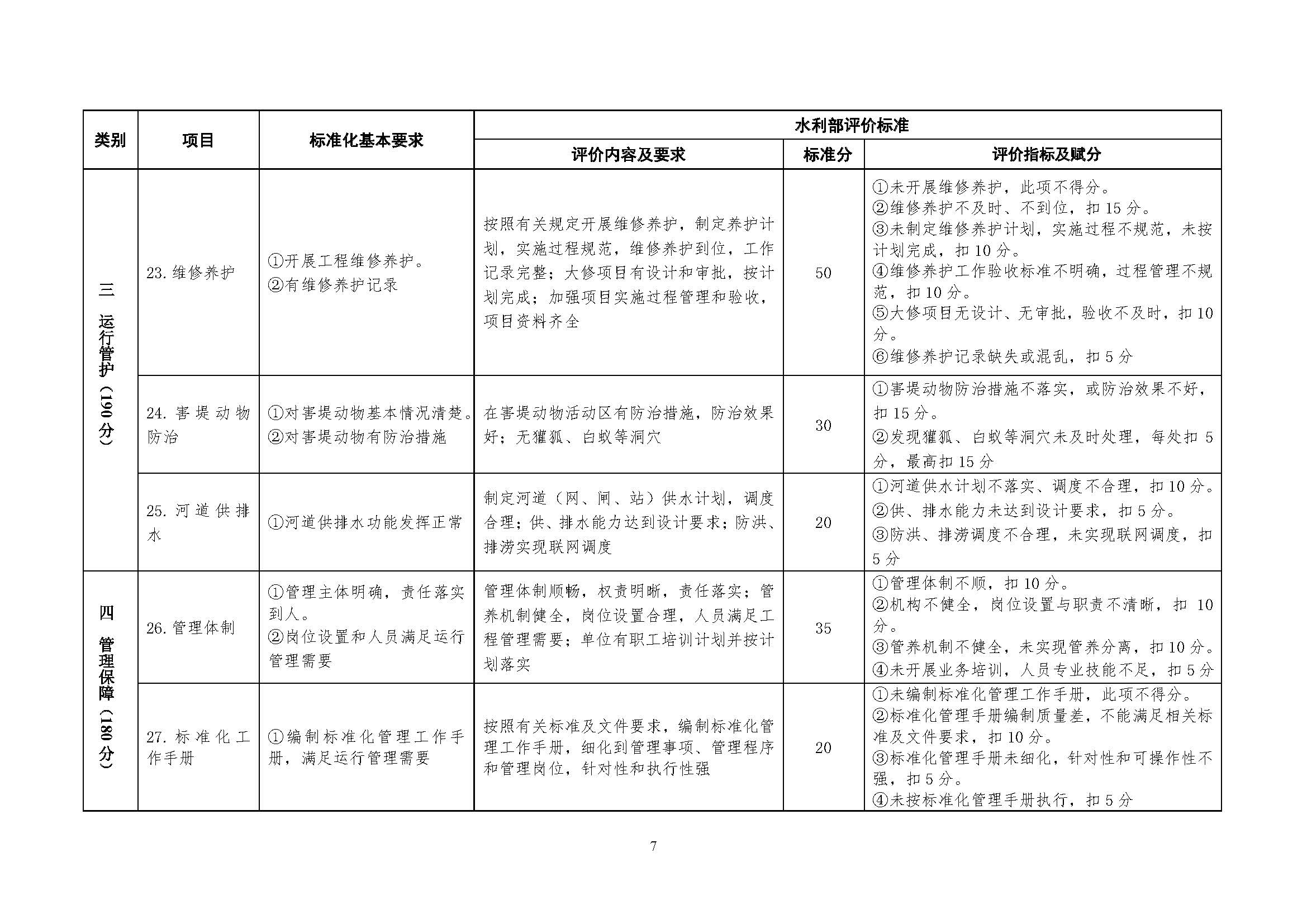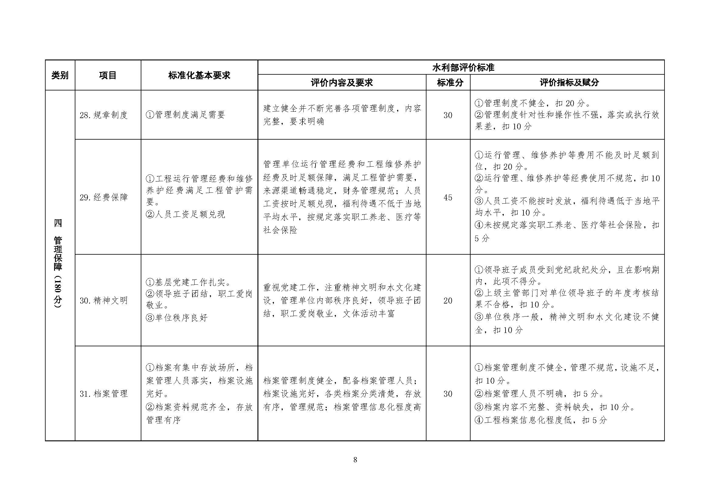 與《指導意見》相配套,同時印發了《評價辦法》及其評價標準,對標準化評價的適用范圍、評價主體、評價程序等作出規定,包括大中型水庫、大中型水閘、3級以上堤防評價標準。