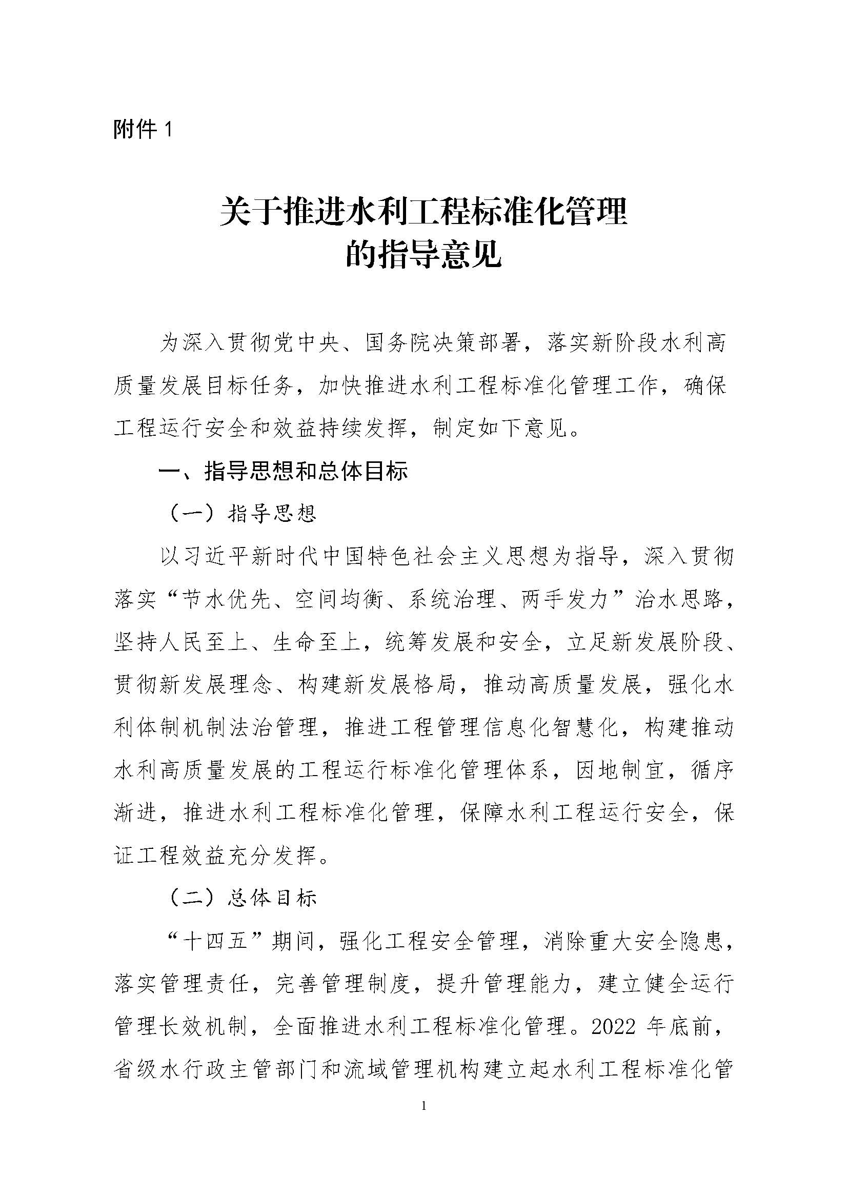 《指導意見》明確了推進水利工程標準化管理的指導思想和總體目標,要求2022年底前,省級水行政主管部門和流域管理機構建立起水利工程標準化管理制度標準體系,全面啟動標準化管理工作;2025年底前,除尚未實施除險加固的病險工程外,大中型水庫全面實現標準化管理,大中型水閘、泵站、灌區、調水工程和3級以上堤防等基本實現標準化管理;2030年底前,大中小型水利工程全面實現標準化管理。