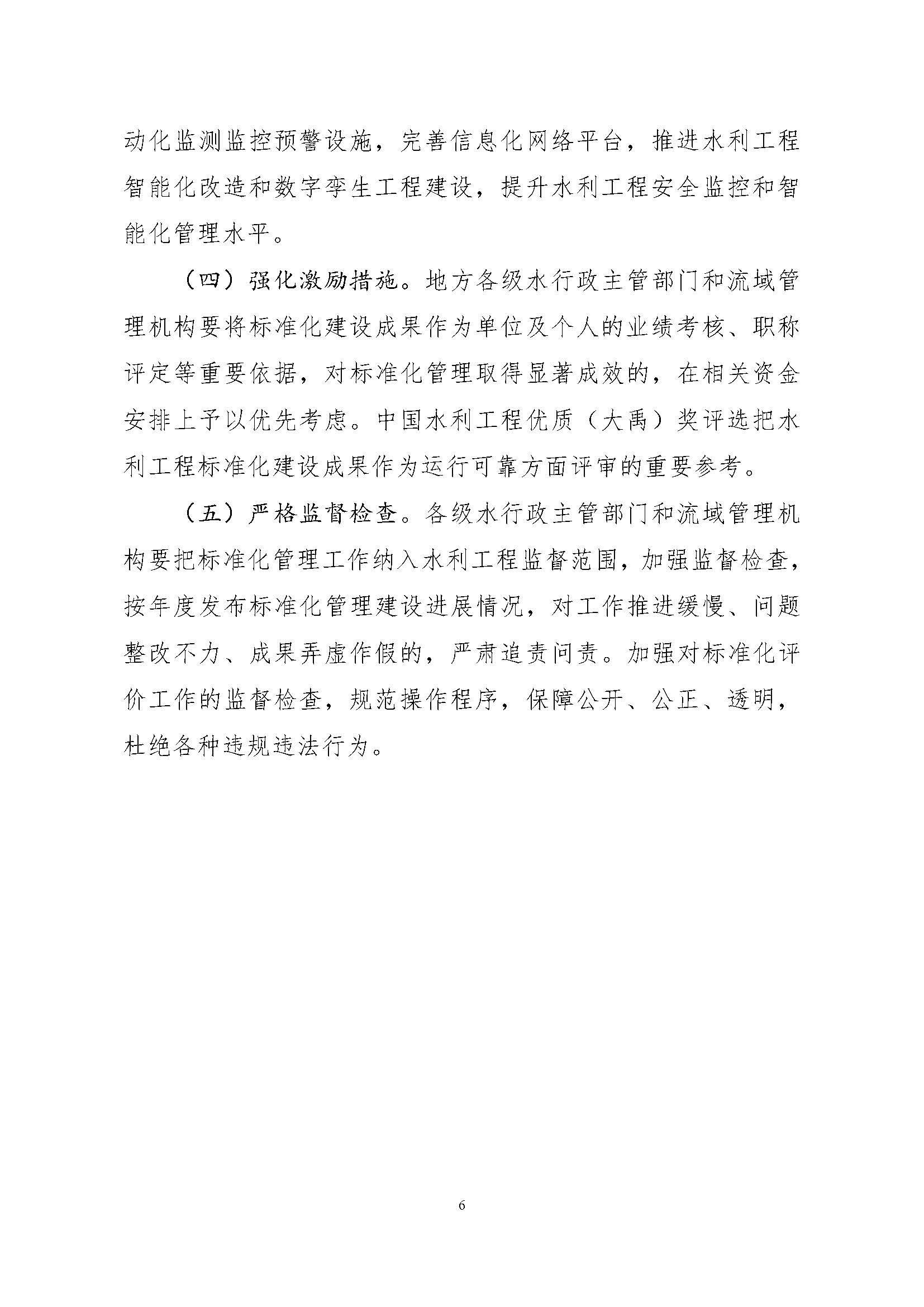 《指導意見》強調,要落實管理責任,規范管理行為,提高管理能力,在工程狀況、安全管理、運行管護、管理保障和信息化建設等5個方面滿足標準化管理要求。《指導意見》還確定了制定實施方案、建立運行管理標準體系、推進標準化管理的實施、做好標準化管理評價等工作步驟和具體內容,提出了保障措施。
