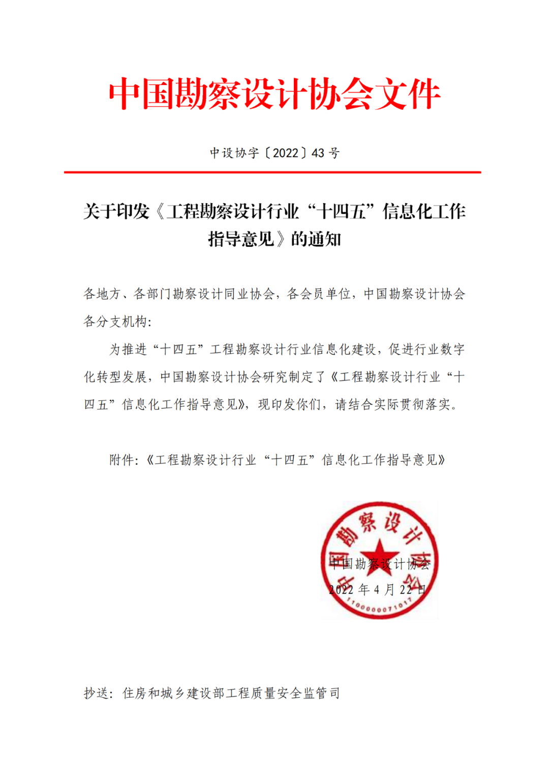 為推進“十四五”工程勘察設計行業信息化建設,促進行業數字化轉型發展,中國勘察設計協會研究制定了《工程勘察設計行業“十四五”信息化工作指導意見》,并印發通知予以發布。