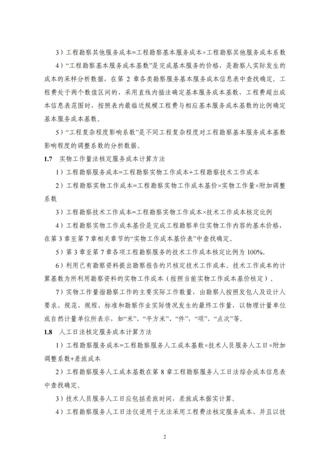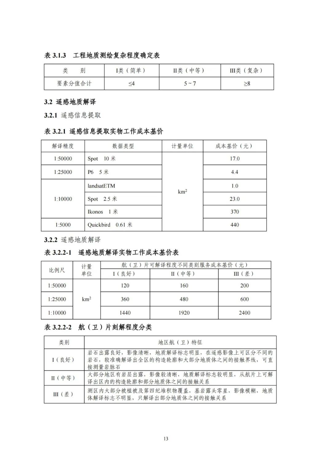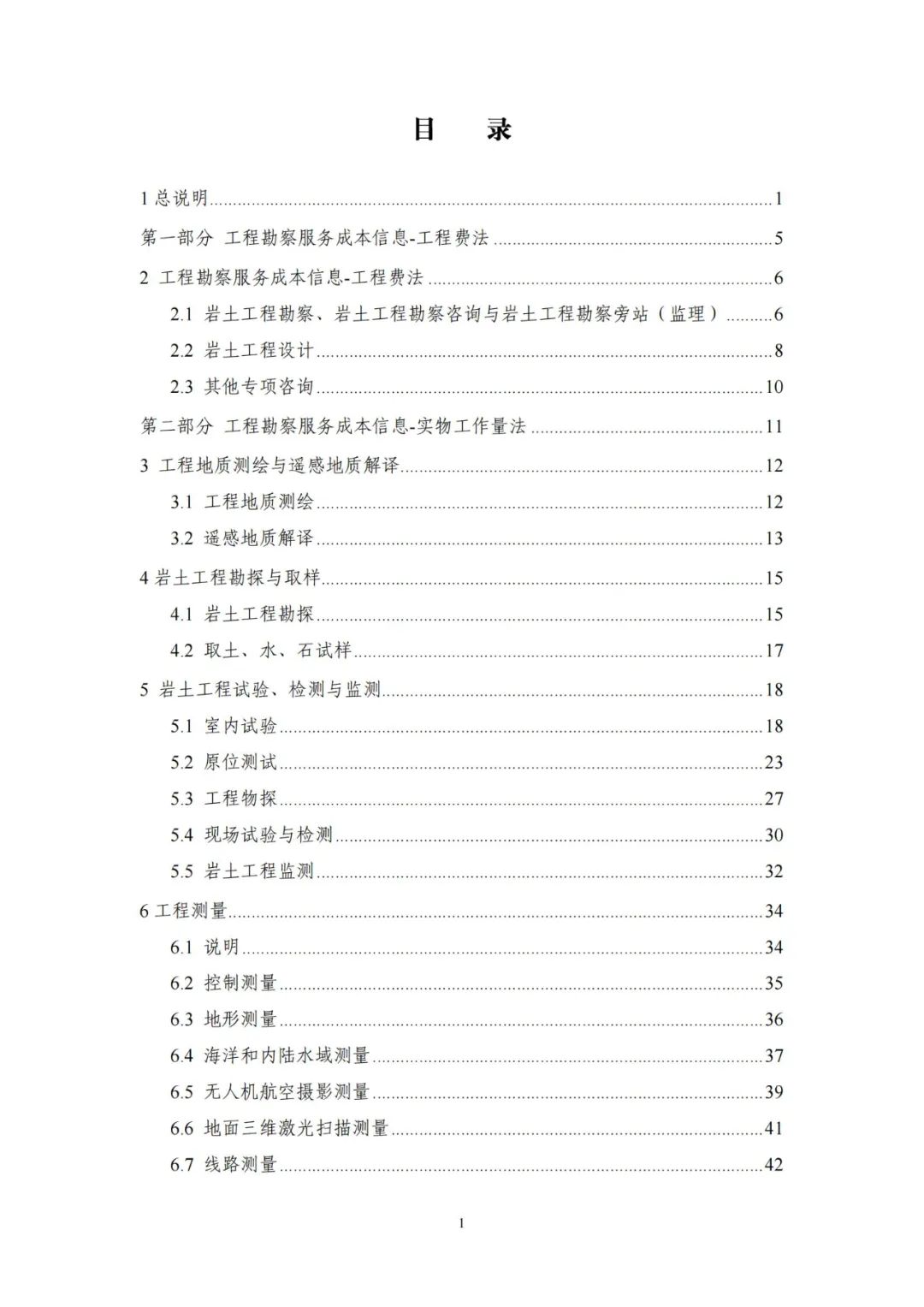 《要素信息》分為八章,相關成本測算分為工程費法(其包含巖土工程勘察、巖土工程勘察咨詢與監理、巖土工程設計和專業工程咨詢)、實物工作量法(其包含工程地質測繪與遙感地質解譯、巖土工程勘探與取樣、巖土工程試驗/檢測與監測、工程測量、水文地質勘察)及人工日法三類。除傳統的巖土工程試驗、測試和工程測量項目外,實物工作成本包括了土的易溶鹽及導熱系數等室內試驗、多功能數字式孔壓靜力觸探試驗、溫度測量等工程物探、海洋和內陸水域測量、無人機航空攝影測量、地面三維激光掃描測量、規劃測量等以新技術方法為主的專業技術服務項目。
